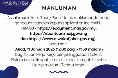 Majlis Agama Islam Negeri Johor (MAINJ) merakamkan setinggi-tinggi penghargaan dan ucapan terima kasih kepada seluruh pembayar zakat, pewakaf serta para penyumbang infaq atas kepercayaan dan tanggungjawab yang telah ditunaikan sepanjang tahun 2025. Komitmen... READ MORE