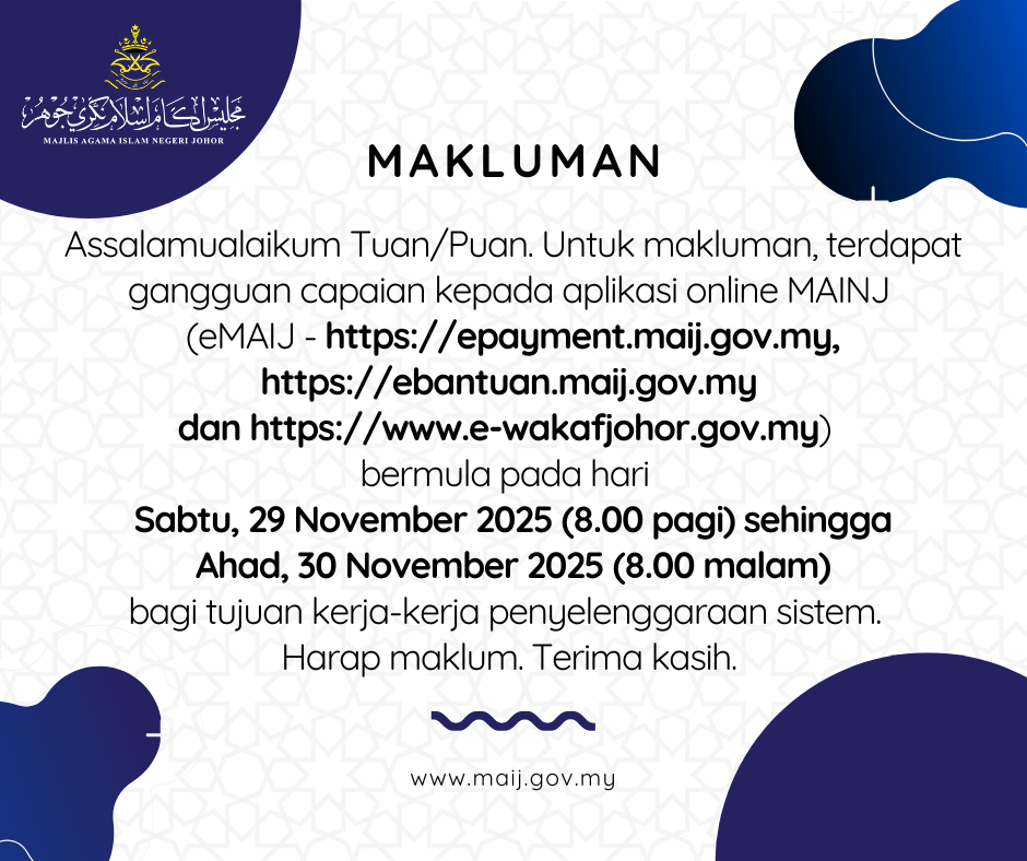 28 Nov 2025 Makluman : Kerja-kerja penyelenggaraan Sistem by admin | posted in: Umum | 0 Makluman gangguan capaian Sistem online eMAIJ atas sebab kerja-kerja penyelenggaraan sistem.