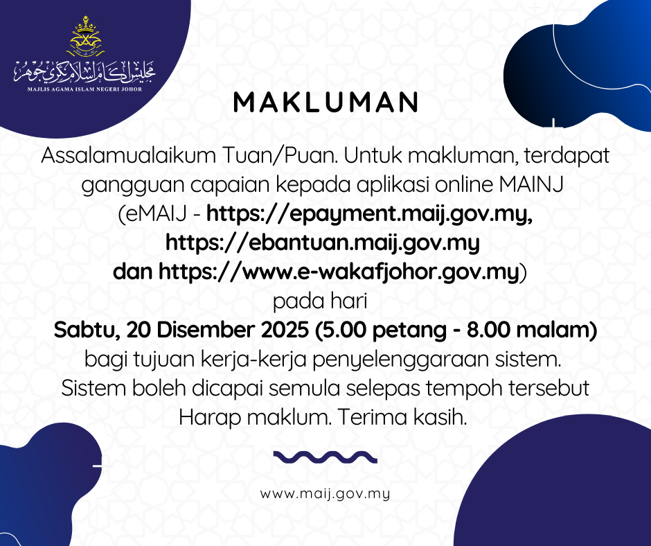 19 Dec 2025 Makluman kerja-kerja penyelenggaraan Sistem by admin | posted in: Umum | 0 Makluman gangguan capaian Sistem online MAINJ atas sebab kerja-kerja penyelenggaraan sistem.