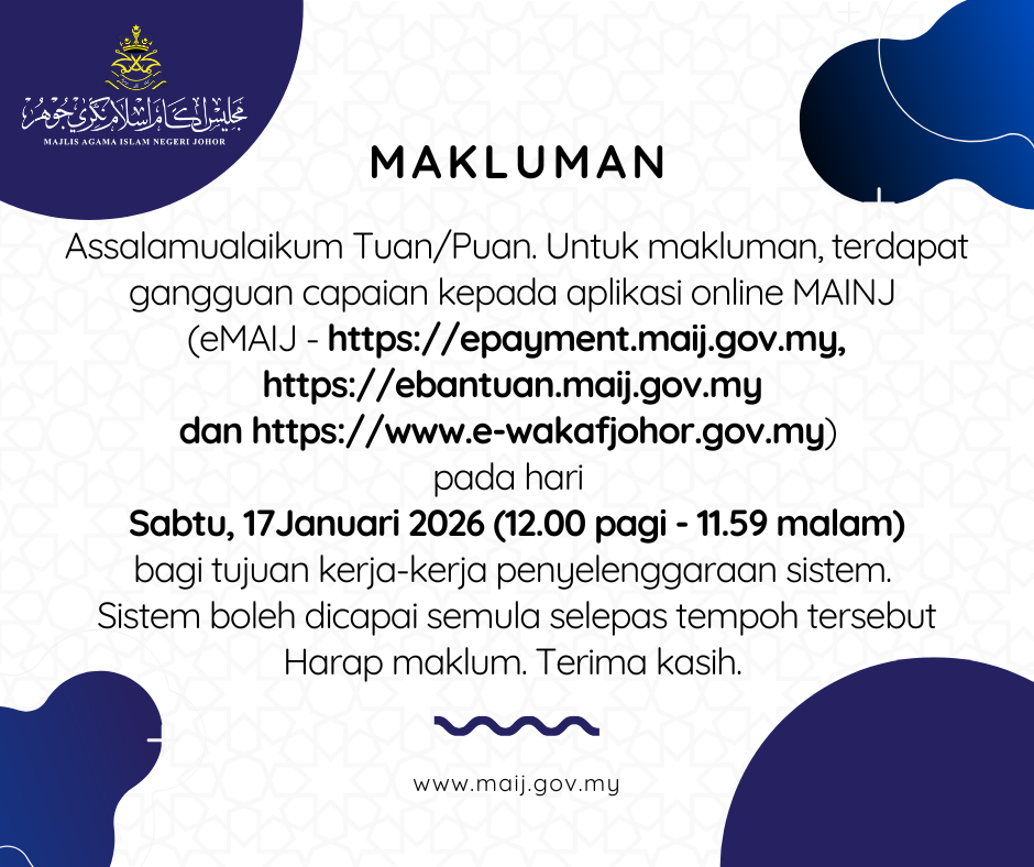 16 Jan 2026 Makluman kerja-kerja penyelenggaraan Sistem by admin | posted in: Umum | 0 Makluman gangguan capaian Sistem online MAINJ atas sebab kerja-kerja penyelenggaraan sistem.