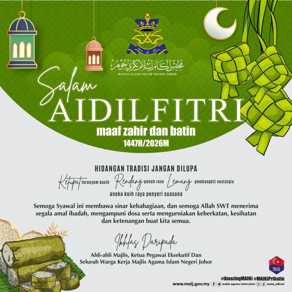 Selamat Hari Raya Aidilfitri 1447H/2026M. Maaf zahir dan batin daripada Ahli-Ahli Majlis, Ketua Pegawai Eksekutif serta seluruh warga kerja Majlis Agama Islam Negeri Johor.