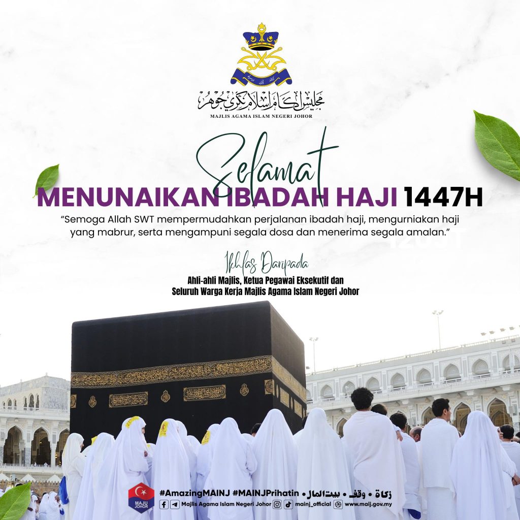 Majlis Agama Islam Negeri Johor (MAINJ) mengucapkan setinggi-tinggi tahniah dan selamat berangkat kepada seluruh jemaah haji yang akan menunaikan rukun Islam kelima pada tahun ini.